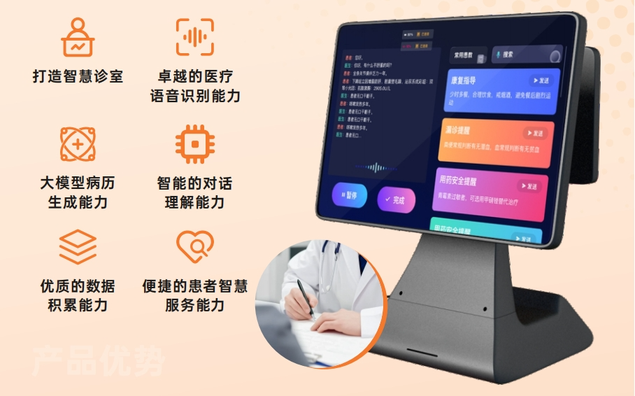 目前听译机器人已覆盖35个科室中的6000多种常见病,配合智想无界的智慧门诊系统,提供智能自诊、智能问药、智能问答、在线咨询、智能导诊、智能预问诊、诊室机器人等产品,以及零售连锁药店智慧服务、医院智慧服务等解决方案,可根据不同需求接入,构建了诊前、诊中、诊后一体化的智能诊疗流程,赋能医疗健康行业。