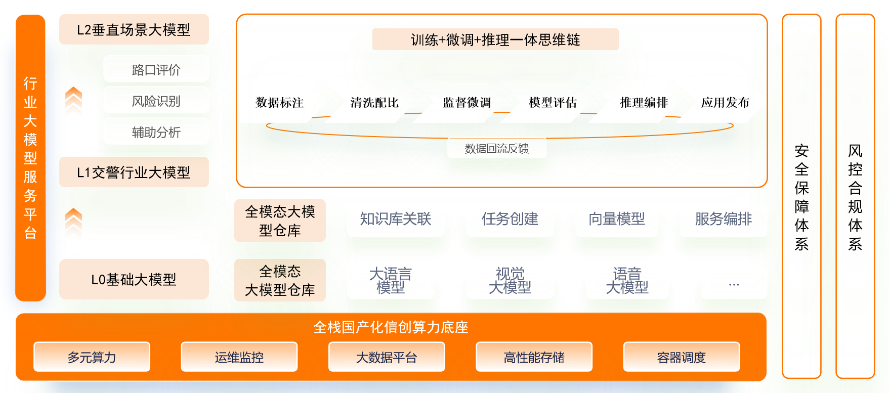 交通大模型架构涵盖基础大模型、交通行业大模型、垂直场景大模型等层级,融合语言、视觉、语音等多种模态,从通用大模型向行业细分场景定制化模型演进。全栈国产化信创算力底座为大模型提供坚实支撑,多元算力、运维监控、大数据平台等要素保障系统稳定运行。