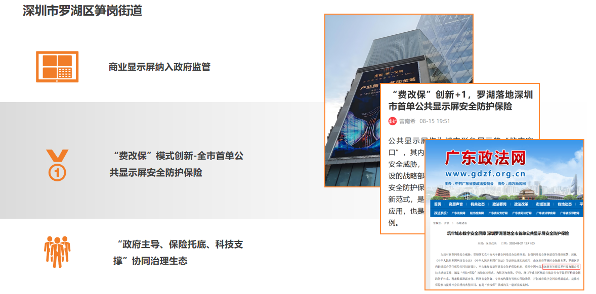 为应对新型网络安全威胁,贯彻落实党中央关于健全网络综合治理体系、加强网络安全体制建设等战略部署,深化《中华人民共和国网络安全法》《中华人民共和国广告法》等法律法规实践应用,由深圳市罗湖区金融服务署、罗湖区笋岗街道联合国任保险共同创新设计,率先推行智慧屏媒安全防护保险机制,借助中国电信及深圳市智想无界科技有限公司技术赋能支持,通过“科技+保险”双轮驱动模式,为辖区内商场、学校、路口等重点区域的首批公共电子显示屏构筑全链路防护体系,覆盖数据泄露责任、网络安全防御、专业机构服务等核心风险场景,开创城市数字空间治理新范式,是推动保险参与提升社会治理的典型应用,也是“费改保”领域的又一创新实践案例。